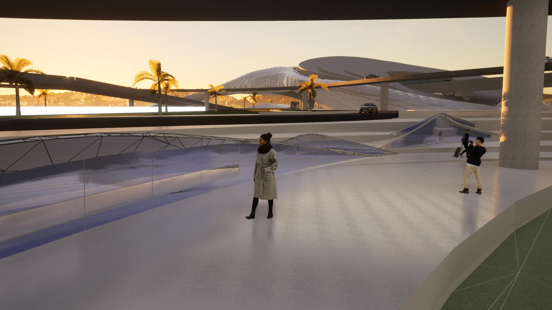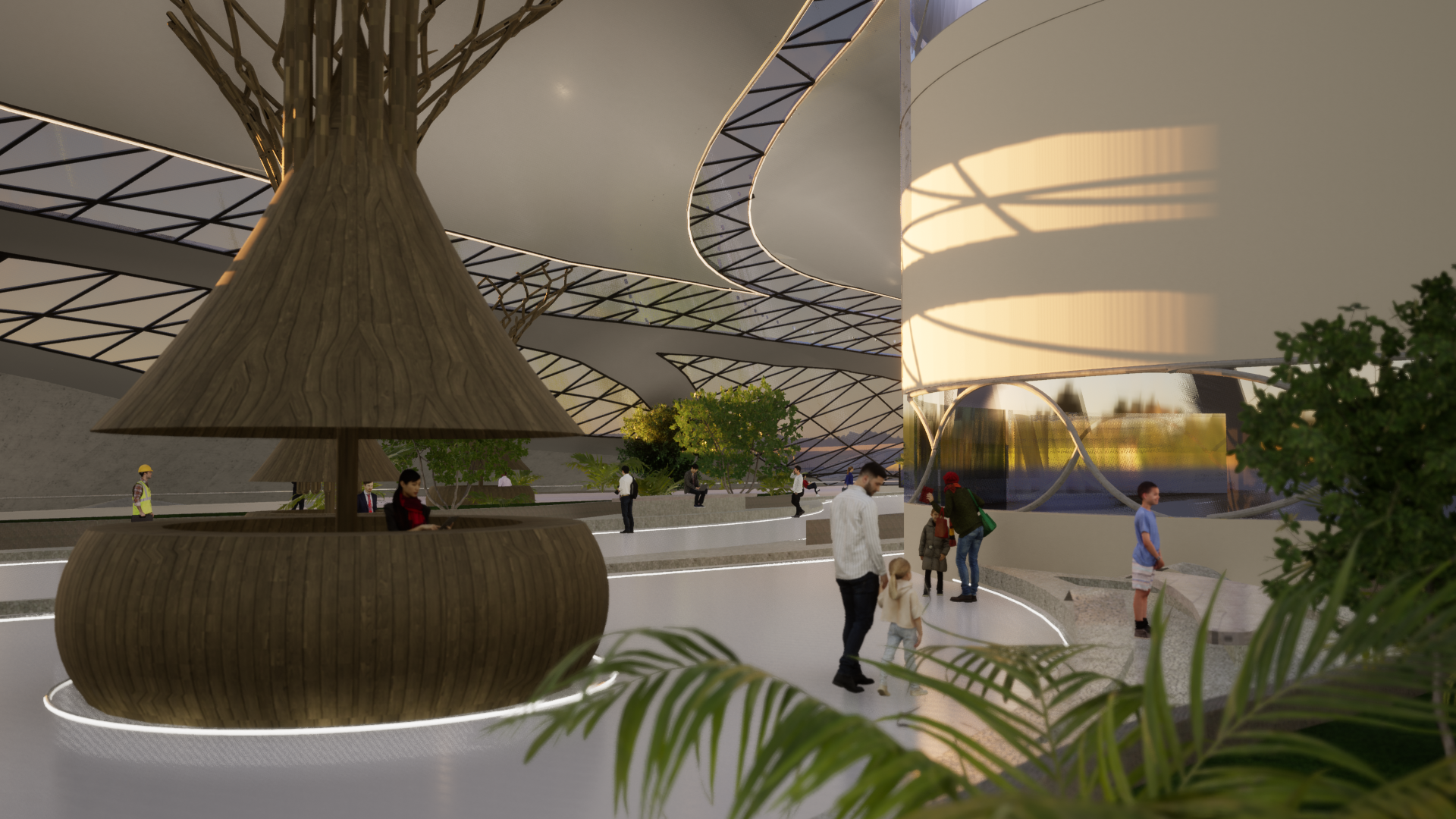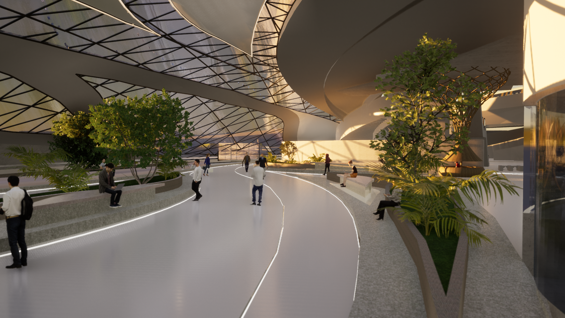 The public promenade gives space For shopping kiosks replacing the already existing Street venders, the pathway acts as a multipurpose Walking and cycling track which is all well Synchronized with the fluidity of nature where People and the form come together to create.